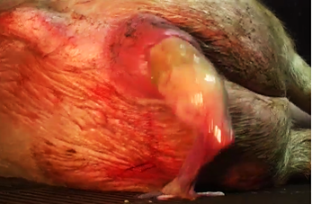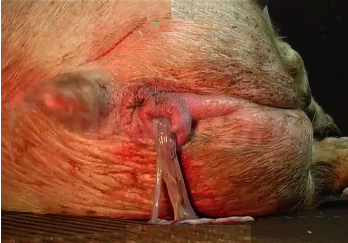 En la acción de la oxitocina materna, aumentan las contracciones en el que se observa un sígno particular en la cola, la cual, oscila constantemente, luego arroja meconio e inmediatamente la expulsión de un feto.